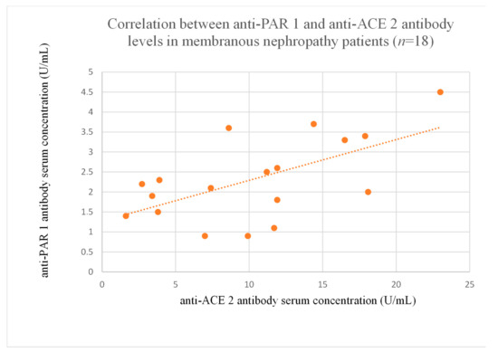 Correlation between anti-PAR 1 and anti-ACE 2 antibody levels in membranous nephropathy patients (r = 0.51, p = 0.03).