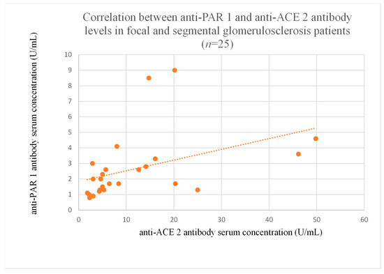 The correlations between anti-PAR 1 and anti-ACE 2 antibodies were significant in membranous nephropathy (Figure 20) and FSGS (Figure 21), with lower anti-PAR 1 levels than the control group (Figure 2). Moreover, correlations were marked between both antibodies and the clinical course of FSGS. These findings suggest a role for these antibodies in FSGS pathogenesis and indicate that anti-PAR 1 and anti-ACE 2 could be useful prognostic markers and that the pathways of the two are connected throughout FSGS development. Moreover, the observations are consistent with research showing that PAR 1 activation induced an FSGS model in mice [18]. Some researchers suggest that PAR 1 may be important for maintaining a proper glomerular filtration barrier, but they were unsure [19]. Our study seems to support this thesis.