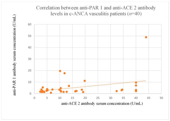 Correlation between anti-PAR 1 and anti-ACE 2 antibody levels in c-ANCA vasculitis patients (r = 0.35, p = 0.02).
