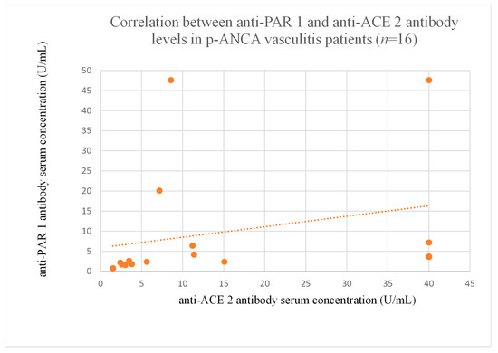 Correlation analysis between quantitative variables employed Pearson’s or Spearman’s correlation coefficient, following a Shapiro–Wilk test to determine data distribution. The significance of correlations was determined using a t-test, with p < 0.05 signifying a positive result. The correlation analysis compared anti-PAR 1 and anti-ACE 2 antibody levels with clinical data. Additional comparisons included the levels of ANA (antinuclear antibodies) in LN patients, c-ANCA in granulomatosis with polyangiitis patients, and p-ANCA in p-ANCA-positive vasculitis patients with anti-PAR 1 and anti-ACE 2 antibody concentrations.