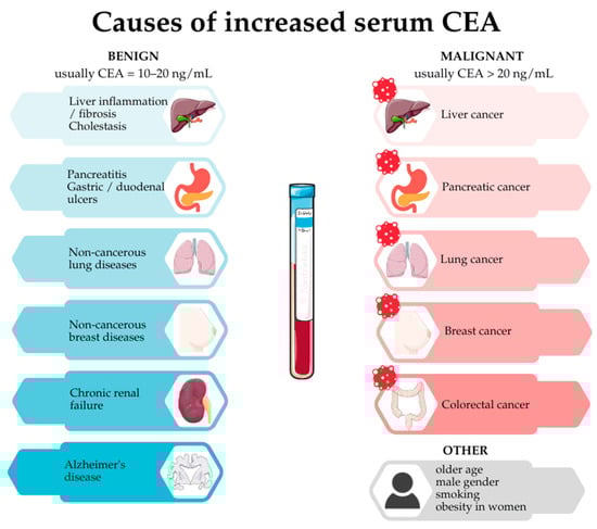 In simple terms, it can be assumed that non-cancerous causes provoke a lower rise in serum CEA (in the range 10–20 ng/mL), whereas if cancer is the underlying cause, the values exceed 20 ng/mL, especially when dealing with disseminated disease [1,5]. However, it is not a rule that can be universally applied as there are patients with metastatic disease with low levels of CEA in the blood [13]. In addition, it is worth remembering that factors such as older age, male gender, smoking, and obesity in women may contribute to slightly elevated CEA levels [12,14]. As a result, not every deviation of CEA concentration from the norm indicates the presence of a serious pathology. Figure 1 provides a brief graphical summary of the causes of increased serum CEA levels.