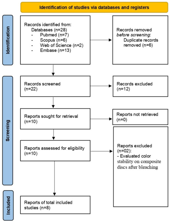 A total of 28 studies were initially identified from the database search conducted in August 2024 (Updated in December 2024). After removing duplicates, 22 studies remained, and their titles and abstracts were screened based on the predefined inclusion and exclusion criteria. Ten studies were considered potentially eligible and underwent full-text review. Of these, eight met the selection criteria (Figure 1). Two studies were excluded because they assessed color stability on composite discs, rather than evaluating color adjustment in bleached teeth [12,15].
