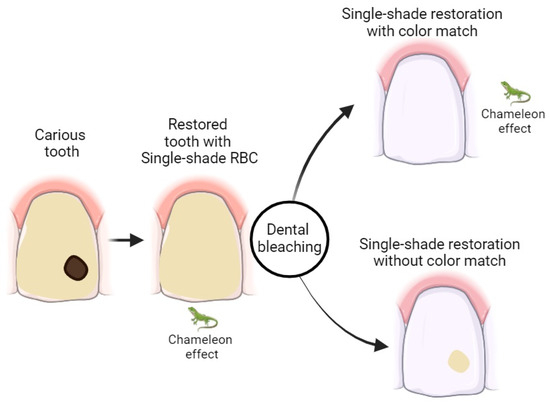 When comparing single-shade and multishade RBCs, Cubukcu et al. [23] found that single-shade RBCs exhibited a weaker color match with the tooth. In contrast, Forabosco et al. [19] and Forabosco et al. [20] reported that single-shade RBCs showed a better color match after bleaching.