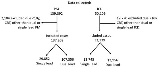 In Germany, all hospitals are legally required (SGB V) to collect patient-specific data for quality assurance (QS) related to cardiac device implantation. The QS database of North Rhine-Westphalia (NRW) recorded all patients who underwent new pacemaker (PM) or implantable cardioverter-defibrillator (ICD) implantations between 2010 and 2014 (n = 189,501). Data for PM and ICD procedures were stored separately in two databases. The chosen time period (2010–2014) was determined based on data availability, as no other data were accessible for analysis at the time due to regulatory restrictions. After excluding patients under 18 and those with device types other than dual- and single-lead, 169,547 patients remained for analysis. During the study period, 137,208 dual- or single-lead PMs and 32,339 dual- or single-lead ICDs were implanted in NRW and included in this retrospective case-control study (Figure 1).