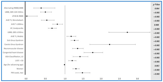 In both the PM and ICD groups, independent risk factors were identified as female sex and the presence of LBBB. Additionally, in the PM group, further independent risk factors for intrahospital complications included young age, congenital heart disease, carotid sinus syndrome, sick sinus syndrome, ASA classification ≥ 2, and the use of dual-lead PMs. On the other hand, alternating RBBB/LBBB, LBBB (120–150 ms), AVB°I and AVB°II (Wenckebach), and bradycardia in AF decrease the risk of a complication (Figure 2).