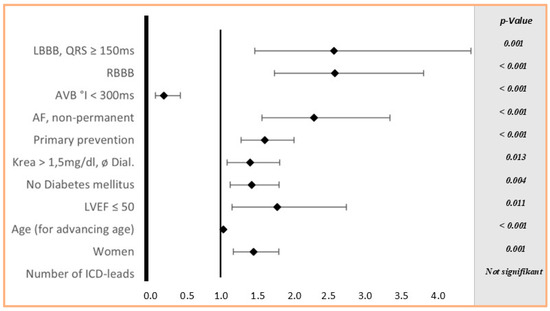 In the ICD group, independent risk factors for complications included advanced age, left ventricular ejection fraction (LVEF) ≤ 50%, absence of diabetes, renal insufficiency without renal replacement therapy, primary prevention indication, and non-permanent atrial fibrillation (Figure 3).