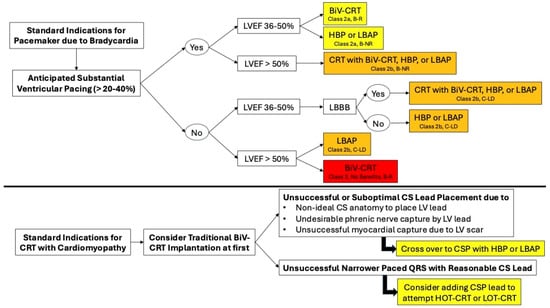 Central illustration: summary of optimal device therapy given clinical presentation. BiV-CRT = traditional CRT; CS = coronary sinus; CSP = conduction system pacing; HBP = His-bundle pacing; LBAP = left bundle area pacing; LV = left ventricle; LVEF = left ventricular ejection fraction.