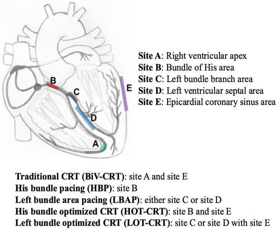 - Liang, Y.; Wang, J.; Gong, X.; Lu, H.; Yu, Z.; Zhang, L.; Li, M.; Pan, L.; Chen, X.; Cui, J.; et al. Left Bundle Branch Pacing Versus Biventricular Pacing for Acute Cardiac Resynchronization in Patients with Heart Failure. Circ. Arrhythm. Electrophysiol. 2022, 15, e011181. [Google Scholar] [CrossRef]