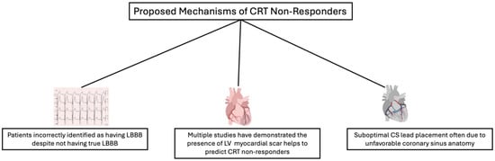 Approximately one-third of traditional CRT receivers did not demonstrate the expected improvements in clinical HF symptoms and/or echocardiographic LV reversed remodeling [,]. The mechanism of CRT non-responders will be multifactorial, as summarized below (Figure 4).