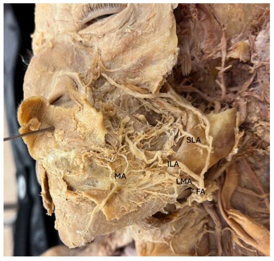 Dermal filler injections are one of the most popular procedures in the United States for facial contouring and rejuvenation []. Understanding the anatomical relationships in this region allows for avoidance of vascular complications, a possible consequence from improper placement of dermal filler []. The MA had the highest prevalence in directly supplying the lower lip in 96% of the sample population. ILA was the second highest prevalence, followed by LMAs with 88% and 43%, respectively.