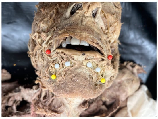 Bilateral Hemifaces Marked for Grid Measurements. Yellow pin: mental foramen, White pin: MA location at vermillion border, Red pin: oral commissure.
