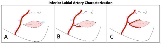 Inferior Labial Artery Characterization. (A): Absent ILA, (B): ILA ramified from FA at level of oral commissure, (C): ILA arising from SLA.