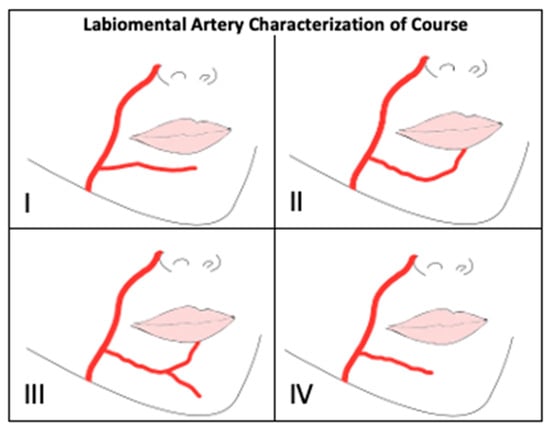Labiomental Artery Characterization of Course. Type (I): Ran horizontal across lower lip area, Type (II): Curved upward to vermillion border of lower lip, Type (III): Bifurcation into two branches, Type (IV): Ran horizontal across chin.