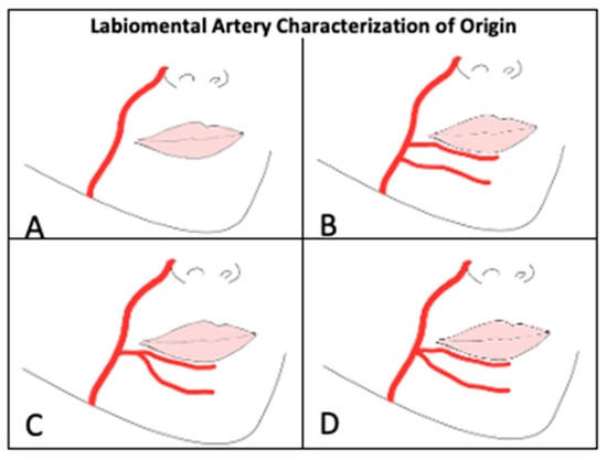 Labiomental Artery Characterization of Origin. (A): absent, (B): originates off FA separately from ILA, (C): Branches off of ILA, (D): Branches off FA at the same location as ILA.