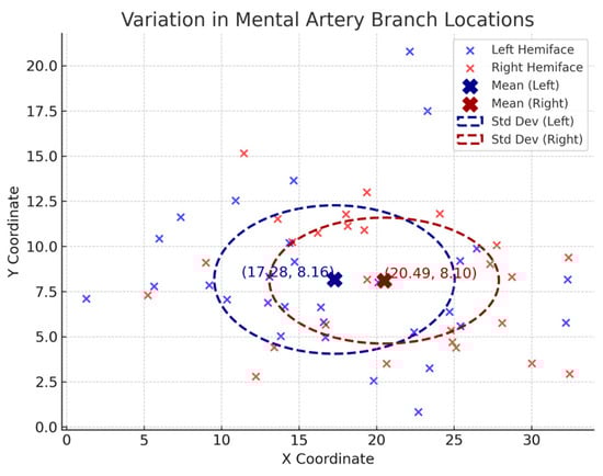 In a subset of 18 donors with bilateral hemifaces included, independent T-tests were used to compare the artery diameters in left and right hemifaces (Table 6). The ILA (p = 0.57), LMA (p = 0.72) and MA (p = 0.83) showed no statistical significance in diameter between left and right hemifaces. Clinically, this suggests that the difference in diameter from left and right can be assumed negligent for the ILA, LMA, and MAs. Statistical analysis comparing the MAs location at which its branches perforated the lower lip between left and right hemifaces is displayed in Table 7. A visual representation of the distribution and variation of this data can be found in Figure 8. For the left hemifaces, 13 branches from 18 donors were found to have a mean horizontal distance of 17 mm medial and 8.2 mm inferior to the oral commissure. As for the right hemifaces, 26 branches from 18 donors yielded a mean horizontal distance of 20 mm medial and 8.1 mm inferior to the oral commissure. The variation in horizontal (left, 60; right, 65) and vertical (left, 17; right, 12) distances were greater in the left hemifaces. Overall, the left hemifaces had a larger variation (38) than the right hemifaces (33). No statistically significant differences exist between right and left hemifaces in respect to horizontal (p = 0.82) and vertical distances (p = 0.86). These findings suggest that despite the left side having slightly more variability in horizontal and vertical distances, it was not significant. While individual artery branch locations vary, the pattern of variation is similar bilaterally. Care should be taken, and appreciation given to the vast variability of arterial branching in the lower lip region. However, our findings do not suggest that one side poses a higher risk of complications than the other.