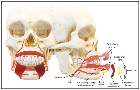 In recent years, the demand for non-surgical aesthetic procedures has escalated, with dermal fillers emerging as a leading choice for facial rejuvenation and enhancement []. Among these procedures, lower lip augmentation has gained significant attention due to its impact on facial aesthetics and overall symmetry. The lower lip, in particular, is a prominent feature in facial attractiveness and plays a crucial role in expressions of emotion, speech, and social interaction []. As a result, non-surgical treatments aimed at improving lower lip volume, definition, and symmetry have become increasingly popular in both clinical and cosmetic settings. As with any aesthetic procedure, the goal is to maximize patient satisfaction, while minimizing poor outcomes. To achieve this, providers should know the anatomical considerations, safe procedure practices, and possible complications in order to provide effective dermal filler injections.