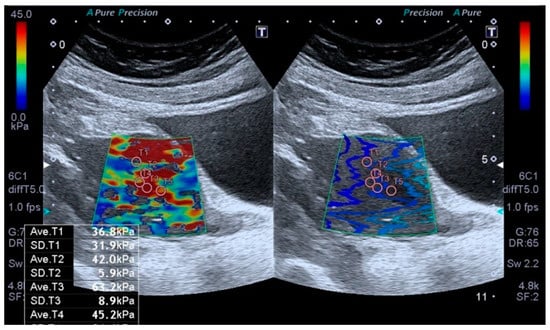 Figure 1. Transabdominal ultrasound examination of the endometrium, including shear wave elastography (SWE). Placement of sample points of the region of interest (ROI) in the endometrial lesion for SWE measurements.