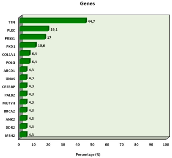 The genes present in the cases are as follows: TTN in 44.7% (n = 21), PLEC in 19.1% (n = 9), PRSS1 in 17% (n = 8), PKD1 in 10.6% (n = 5), COL1A1 in 6.4% (n = 3), and POLG in 6.4% (n = 3) (Figure 3).