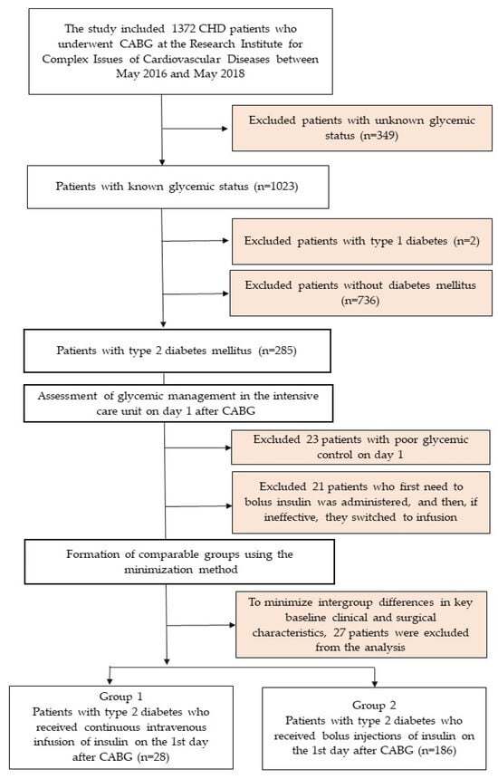 A single-center, open comparative study was conducted. The study included all patients who underwent planned coronary artery bypass grafting (CABG) from 1 May 2016 to 1 May 2018 in the surgical clinic of the Research Institute for Complex Issues of Cardiovascular Diseases (Kemerovo, Russian Federation) and were included in the CABG registry. In total, 1372 patients were operated on during this time, of which 1023 patients with known glycemic status were selected. Then, 2 patients with a diagnosis of type 1 diabetes and 736 patients without type 2 diabetes were excluded, thus forming a sample of 285 patients with an established diagnosis of type 2 diabetes (Figure 1). Demographic and clinical characteristics of the patients and the results of inpatient treatment were obtained by analyzing medical records. The study was conducted in accordance with the principles of the Declaration of Helsinki. All patients signed informed consent to participate in the study. The study protocol was approved by the meeting of the Local Ethics Committee of the Research Institute for Complex Issues of Cardiovascular Diseases with an extract from protocol No. 7 dated 27 April 2017.