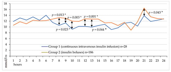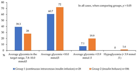 Group 1 demonstrated a trend toward a lower proportion of patients with severe hyper-glycemia (>13.9 mmol/L) compared to the bolus insulin group (7.1% vs. 19.9%, respectively; p = 0.078, Figure 4). Target glucose levels during the first 24 h were achieved in 39.3% of patients receiving continuous intravenous insulin infusion (CIII) versus 28.0% in the control group, suggesting a trend toward better glycemic control with CIII. However, a substantial proportion of patients in both groups failed to reach target values, with mean glucose levels exceeding 10 mmol/L (60.7% and 72% in Groups 1 and 2, respectively; Figure 4). Hypoglycemic events (<3.9 mmol/L) were rare and occurred exclusively in Group 2 (1.6% of cases).