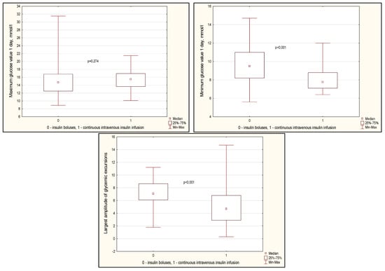 Glycemic variability indicators are presented in Figure 3. There was a tendency towards a lower value of average glycemia on the first day (Figure 3, p = 0.064). At the same time, the standard deviation of glucose fluctuations was slightly higher in the CIT group (p = 0.056). The maximum values of glucose levels on the first day did not differ between the groups, but the minimum values were lower in the CIT group (p < 0.001). At the same time, the range between the maximum and minimum glucose values was also lower in the CIT group (Figure 3, p < 0.001).