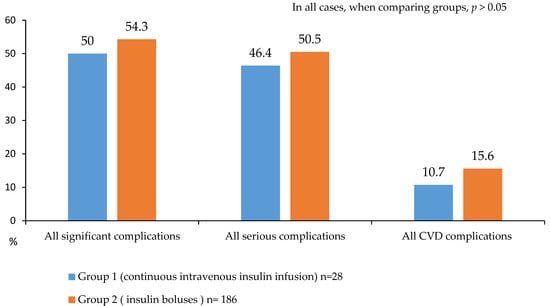 The method of continuous insulin infusion seems to be the optimal way to control glycemia in the postoperative period [13,14]. Thus, in the study by Golukhova EZ et al. [14], it was shown that continuous insulin infusion improves glycemic control and can potentially reduce the risk of the most common complication after CABG-post-pericardiotomy syndrome. In another study, CIT reduced the variability of glucose concentrations and the occurrence of deep sternal wound infection after CABG in a certain group of patients with diabetes with bimammary bypass grafting [13]. However, it was not always possible to prove the benefits of continuous insulin infusion. For example, it was not possible to identify the effect of this treatment method on the incidence of surgical site infections among diabetic patients with CABG [19]. These data show that improved glycemic control after surgery is not always accompanied by a decrease in the number of complications (as in our case). Conflicting data may be due to differences in the timing of interventions, in the working definitions adopted for the treatment groups, or in the acceptable level of hyperglycemia allowed in conventional groups [19].