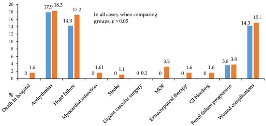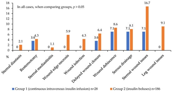 A detailed analysis of in-hospital postoperative complications is presented in Figure 5, Figure 6 and Figure 7. While no statistically significant differences in complication rates were observed between the groups, both groups of diabetic patients demonstrated a high incidence of significant and serious complications (approximately 50% of cases; Figure 5).
