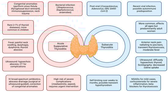 Acute suppurative thyroiditis (AST) and subacute thyroiditis (SAT) represent two different but significant inflammatory diseases of the thyroid gland affecting both children and adults. This review places particular emphasis on the pediatric population while incorporating general data to highlight differences across age groups. Both these conditions present specific diagnostic and therapeutic challenges, especially in pediatric patients, where underlying anatomical abnormalities or systemic predisposition are usually of importance [1]. In fact, the anatomical structure of the thyroid gland, its high iodine content, extensive vascular supply, and fibrous encapsulation offer considerable protection to the gland [2,3]. Differential diagnosis of these two different forms of thyroiditis is recognized to be crucial for management [1,4]. Continued studies concerning the pathogenesis, risk factors, and strategies for the optimum management of both AST and SAT are crucial to improve outcomes in patients and refine approaches to their treatment. Understanding these conditions and addressing gaps in diagnosis and treatment, especially in resource-limited settings, is crucial to reduce the burden and improve outcomes for these conditions.