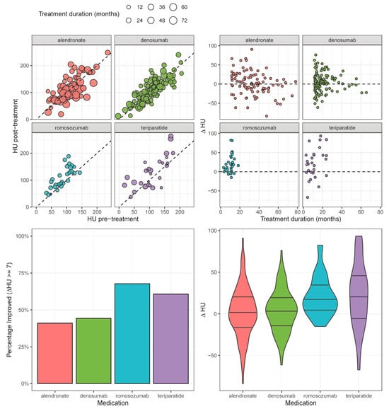 In the present analysis, patient factors, specifically older age, male sex, treatment duration, and baseline bone health (as measured by pre-treatment HU) were associated with both lower odds and magnitude of improvement. Although higher baseline HU typically reflects greater bone mass and might be expected to correlate with better improvement, our findings suggest an inverse relationship and are consistent with those of Tanphiriyakun et al. [17]. This may be explained by the fact that, in individuals with lower baseline bone density, even a modest absolute gain translates into a relatively larger increase in HU measurements. This effect may be particularly pronounced in patients receiving anabolic treatment, as these agents stimulate bone formation, leading to greater relative HU changes compared to antiresorptive therapy. Here, we additionally noted treatment duration to be inversely correlated with HU improvement and the odds of improving by ≥7 HU, which seems counterintuitive. We speculate that this is likely artifactual and reflects the fact that anabolic agents are prescribed for shorter periods of time, as after correcting for treatment duration and other relevant covariates in multivariable modeling, specific medication was not a statistically significant independent predictor of change in HU [18]. Notably, romosozumab and teriparatide were again found to have the most rapid improvement in HU and the greatest odds of improvement [6,18].