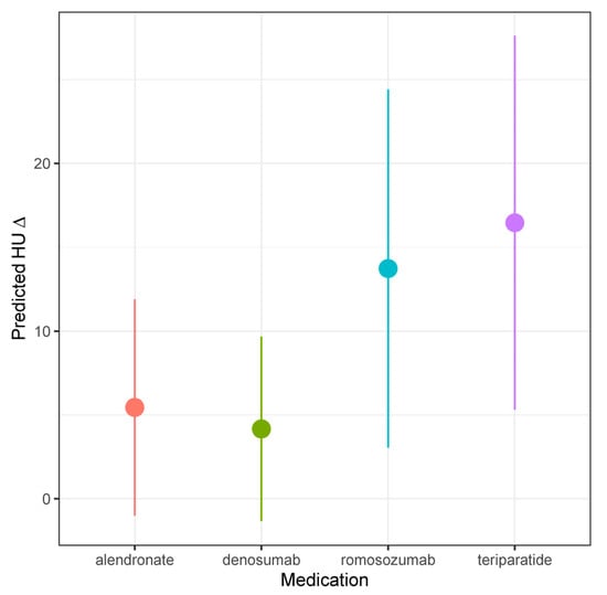In our univariable analysis (Table 2), the odds of improvement (ΔHU ≥ 7) were negatively correlated with male sex (OR 0.54; 95% CI [0.32, 0.90]; p = 0.019) and higher baseline HU (0.99/unit; [0.98, 1.00]; p = 0.006). Among the medications, romosozumab was significantly associated with higher odds of HU improvement (OR 3.02; [1.31, 7.35]; p = 0.012) relative to treatment with alendronate. In our multivariable analysis, male sex (OR 0.53; [0.29, 0.93]; p = 0.028), higher baseline HU (0.99/unit; [0.98, 1.00]; p = 0.002), and age (OR 0.97/year; [0.96, 1.00]; p = 0.049) remained significantly associated with lower odds of HU improvement. However, none of the medications remained significantly associated with HU improvement in the multivariable model.