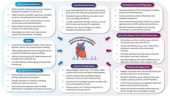 Pathophysiological drivers of atrial cardiomyopathy in atrial fibrillation. Atrial cardiomyopathy (AtCM) arises from a convergence of diverse upstream mechanisms, including inflammasome activation, gut dysbiosis, lipid dicarbonyl stress, epicardial adipose tissue dysfunction, metabolic derangements, ageing, sex-specific remodeling, and genetic predisposition. These processes contribute to the structural, electrical, and thromboembolic remodeling of the atrial myocardium, fostering the initiation and perpetuation of atrial fibrillation (AF).