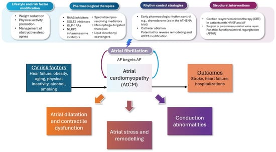 Pathophysiological continuum linking risk factors, atrial cardiomyopathy, atrial fibrillation, and adverse outcomes: therapeutic targets and interventional strategies. Atrial cardiomyopathy arises from the convergence of diverse risk factors—ageing, systemic inflammation, metabolic dysfunction, oxidative stress, and epicardial adipose tissue accumulation—which collectively drive maladaptive atrial remodeling. This remodeling manifests as progressive structural, electrical, and molecular alterations, creating a vulnerable substrate predisposed to the initiation and maintenance of atrial fibrillation. Once established, AF accelerates the underlying myocardial pathology, establishing a self-perpetuating cycle that amplifies thromboembolic risk and contributes to heart failure progression and mortality. Therapeutic strategies span the continuum from upstream prevention to disease modification and downstream rhythm stabilization. Lifestyle interventions, including sustained weight loss and management of sleep-disordered breathing, represent critical upstream targets. Pharmacologic modulation of neurohormonal and metabolic pathways—through RAAS inhibition, SGLT2 inhibitors, and GLP-1 receptor agonists—addresses the core mechanisms of remodeling. Targeted approaches aimed at inflammasome activation, oxidative injury, and fibro-inflammatory signaling offer mechanistically precise avenues for intervention. Rhythm control strategies, particularly early catheter ablation, and structural therapies such as cardiac resynchronization or mitral valve repair, hold promise for reversing remodeling and modifying clinical trajectory. This integrated framework reflects a paradigm shift toward substrate-directed, disease-modifying approaches in the management of atrial fibrillation.