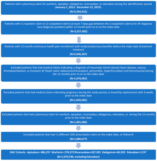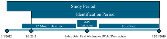 The study period was between 1 January 2012, and 31 December 2019, including a 12-month baseline period. Patients were included in this study if they had ≥1 inpatient claim or ≥2 outpatient claims for AF (at least 7 days gap between the 2 outpatient claims), identified using International Classification of Diseases, Ninth/Tenth Revision, Clinical Modification (ICD-9-CM/ICD-10-CM) diagnosis codes (see Table S1, Supplementary Materials). The first AF diagnosis claim date should lie between 1 January 2013, and 31 December 2019. Patients were required to have a prescription for an OAC in this period, on or after the first AF diagnosis, and had 12 months of continuous health plan enrollment with medical and pharmacy benefits before treatment initiation.
