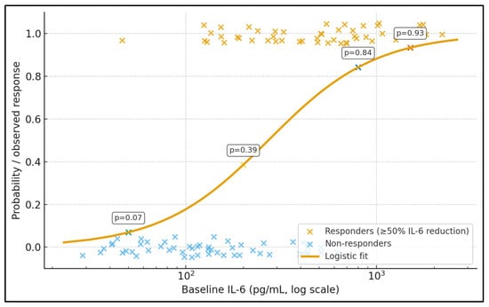 Figure 1 illustrates the relationship between baseline IL-6 (log scale) and the probability of achieving a ≥50% IL-6 reduction after TPE. Each point represents an individual patient (jittered around 0 for non-responders and 1 for responders), while the smooth curve shows the fitted logistic model. Data labels placed on the curve indicate predicted response probabilities at representative IL-6 levels: at 50 pg/mL the estimated probability of response is ≈0.19, rising to ≈0.46 at 200 pg/mL, ≈0.74 at 800 pg/mL, and ≈0.84 at 1500 pg/mL. In this cohort, responders cluster predominantly at higher baseline IL-6 values, whereas non-responders are more common at the lower end of the range. This figure visually supports a non-linear dose–response effect, with a steep increase in response probability once IL-6 exceeds roughly 300–400 pg/mL, reinforcing the idea that TPE has the greatest biochemical impact in patients with very high cytokine burdens.