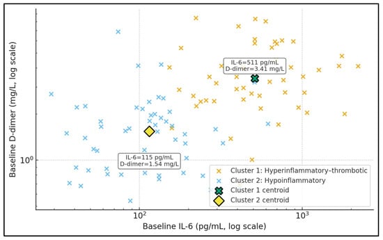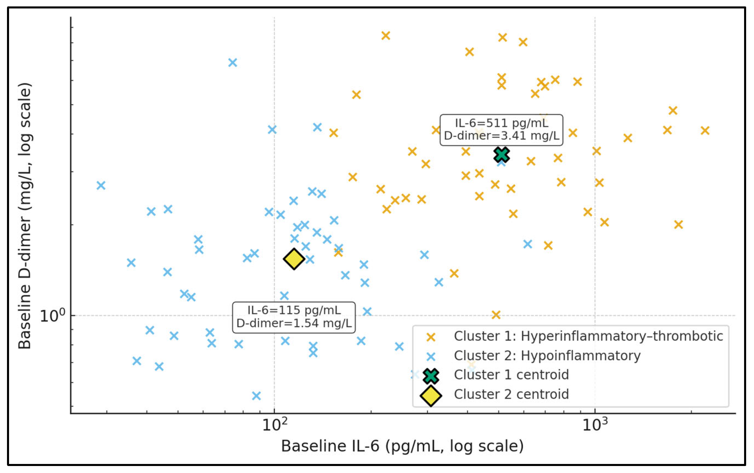 Figure 2 displays baseline IL-6 and D-dimer in log–log space, stratified into two unsupervised clusters. Cluster 1 (hyperinflammatory–thrombotic) is characterised by a centroid IL-6 of approximately 515 pg/mL and D-dimer 3.46 mg/L, while Cluster 2 (hypoinflammatory) has a centroid IL-6 around 128 pg/mL and D-dimer 1.59 mg/L, as shown by the data labels attached to the centroid markers. Patients in Cluster 1 populate the upper-right portion of the plot, combining high cytokinaemia with substantial coagulation activation, whereas Cluster 2 occupies lower IL-6 and D-dimer ranges. This separation illustrates that TPE is being applied to at least two biologically distinct phenotypes. In the context of your tables, the more “hyperinflammatory–thrombotic” patients not only receive more intensive TPE but also exhibit higher IL-6 responder rates, suggesting that clustering based on IL-6 and D-dimer may be a pragmatic way to identify a TPE-responsive subgroup.