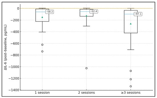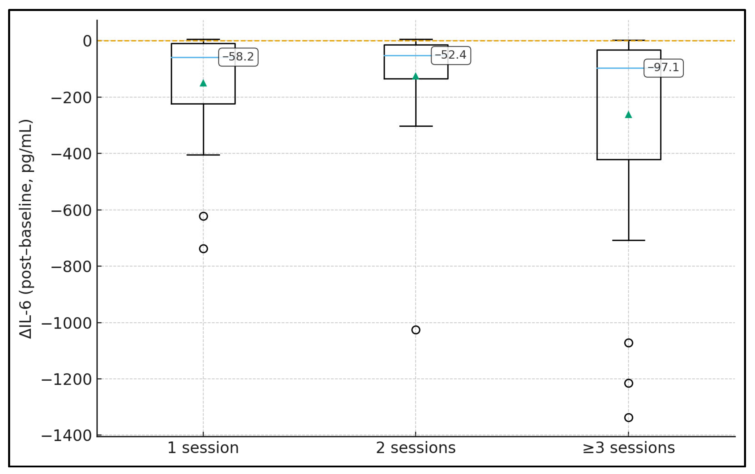 p = 0.005). Baseline IL-6 showed a trend toward higher levels in the ≥3-session group (305.5 pg/mL, IQR 53.2–1306.3) than in the 1-session (143.1 pg/mL) or 2-session (37.0 pg/mL) groups (