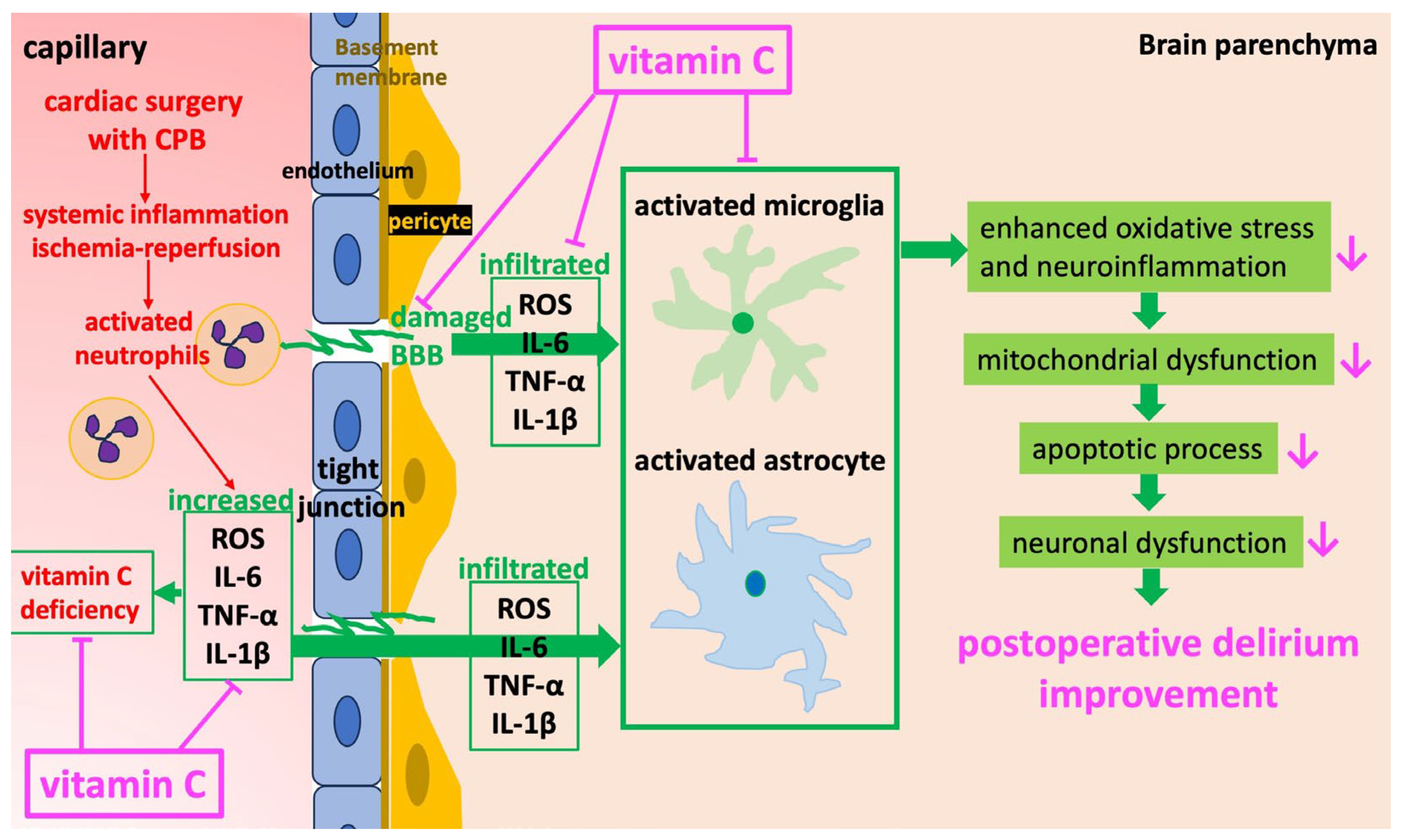 - Chang, C.Y.; Chen, J.Y.; Wu, M.H.; Hu, M.L. Therapeutic treatment with vitamin C reduces focal cerebral ischemia-induced brain infarction in rats by attenuating disruptions of blood brain barrier and cerebral neuronal apoptosis. Free Radic. Biol. Med. 2020, 155, 29–36. [Google Scholar] [CrossRef]