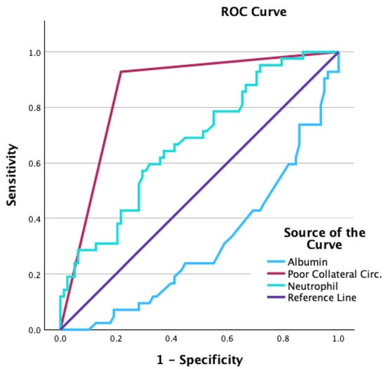 The parameters that showed statistically significant differences between the two groups in univariate analysis were evaluated with univariate logistic regression analysis (Table 1). In the course of conducting regression analysis, the parameters including furosemide, oral anticoagulants, fasting glucose, triglycerides, white blood cell count, left ventricular diastolic diameter, left ventricular systolic diameter, and left ventricular ejection fraction were systematically excluded. As a result, serum albumin level (OR = 0.711, 95% CI 0.564–0.896; p = 0.004), serum neutrophil level (OR = 1.478, 95% CI 1.080–2.022; p = 0.10), and poor collateral flow (OR = 17.7, 95% CI 12.2–85.3; p < 0.001) were found to be independent predictors of increased QRS-T angle (Table 3). The sensitivity and specificity of collateral detecting increased QRS-T angle by ROC analysis were AUC = 0.855, p < 0.001 and AUC = 0.693, p = 0.001, respectively (Figure 1).