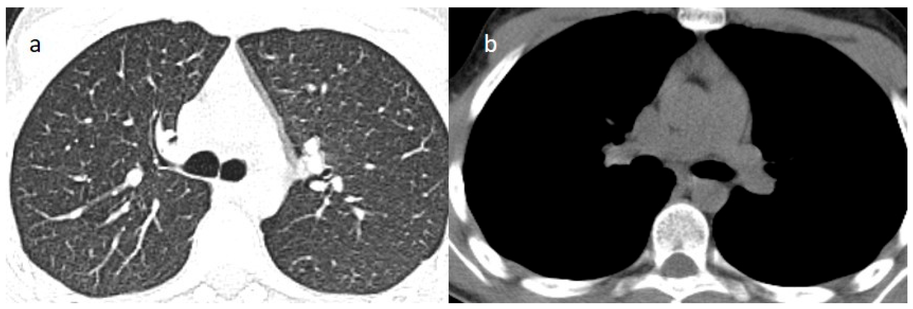 - Cellina, M.; Cè, M.; Cozzi, A.; Schiaffino, S.; Fazzini, D.; Grossi, E.; Oliva, G.; Papa, S.; Alì, M. Thymic Hyperplasia and COVID-19 Pulmonary Sequelae: A Bicentric CT-Based Follow-Up Study. Appl. Sci. 2024, 14, 3930. [Google Scholar] [CrossRef]