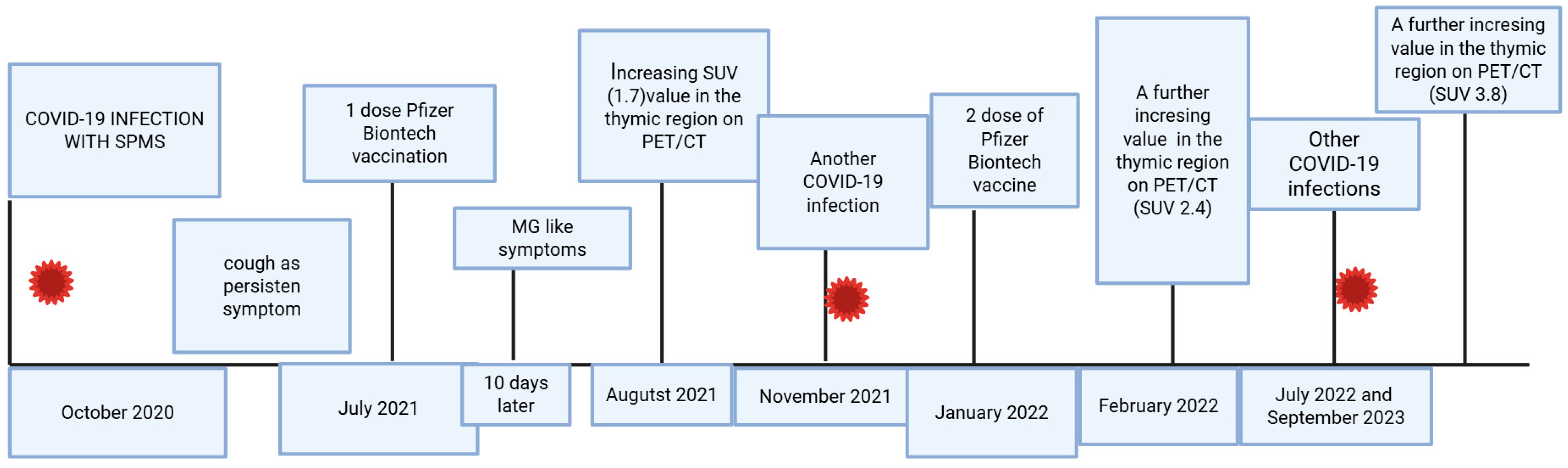 Chicago/Turabian StyleBrogna, Barbara, Mariagrazia Nunziata, Luigi Urciuoli, Annamaria Romano, Antonietta Laporta, and Claudia Brogna. 2026. "Spontaneous Pneumomediastinum in COVID-19 and Myasthenic-like Symptom Complications in Two Relatives: A Coincidence or Spike Toxicity with Thymic Response in Predisposed Individuals? Two Clinical Cases with a Comprehensive Literature Review" Journal of Clinical Medicine 15, no. 1: 159. https://doi.org/10.3390/jcm15010159