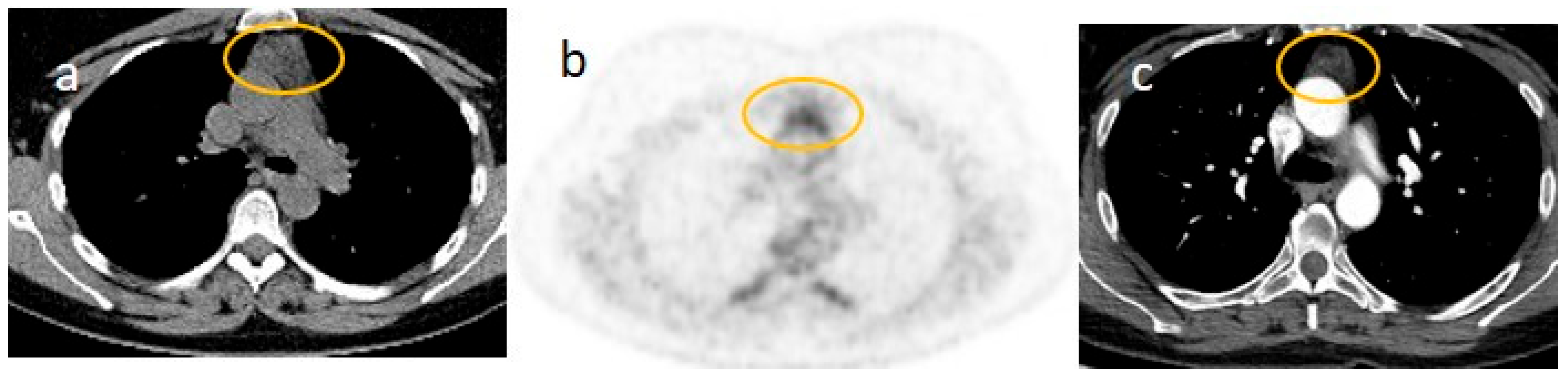 - Sharma, P.; Singhal, A.; Kumar, A.; Bal, C.; Malhotra, A.; Kumar, R. Evaluation of thymic tumors with 18F-FDG PET-CT: A pictorial review. Acta Radiol. 2013, 54, 14–21. [Google Scholar] [CrossRef]