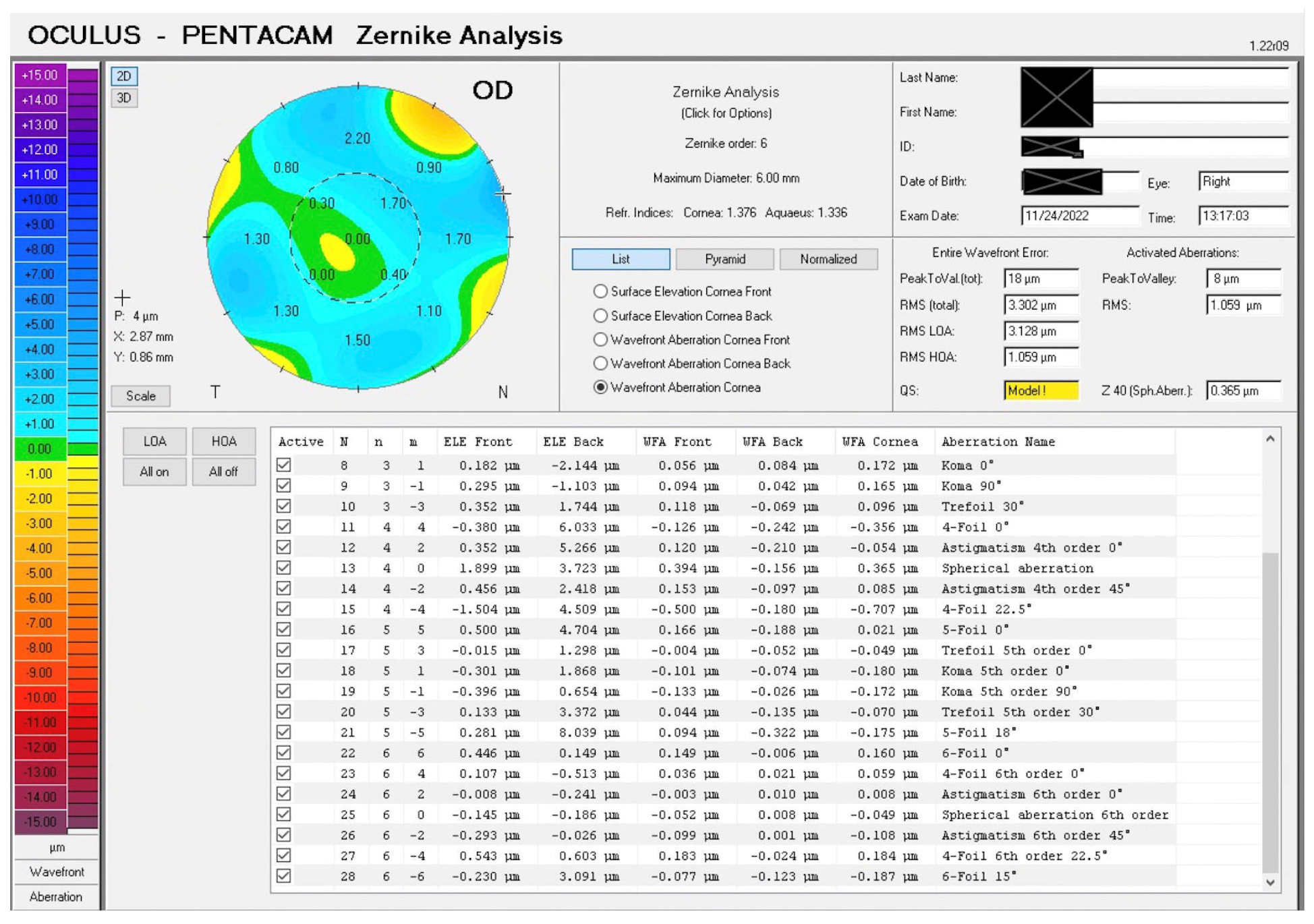 | RMS Lower-Order Aberrations (LOAs) | - | 6.858 (±3.524) | 3.965 (±1.830) | 0.001 |