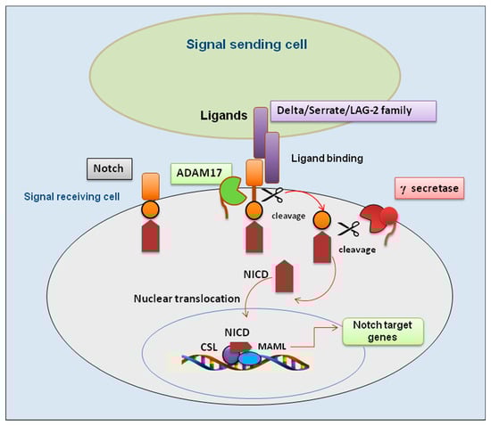 The Notch pathway is an evolutionarily preserved signaling system that modulates multifaceted activities in a wide range of cellular events, which is implicated in reorganization and regeneration of tissues and in intricate interactions with other signaling pathways [1,2]. The induction of Notch signaling occurs through a finely regulated cascade of proteolytic cleavages with subsequent triggering of downstream target genes [3,4]. Notch receptors can cooperate with Notch ligands when a ligand of the Delta/Serrate/LAG-2 family (positioned on the surface of bordering cells) binds to the extracellular domain of the Notch receptor and activates proteolytic cleavage by a member of the disintegrin and metalloprotease (ADAM) family. ADAM10 and/or ADAM17 cleavage produces a substrate for an additional cleavage, generating a Notch extracellular form of the receptor, which is a membrane-bound Notch fragment. Following, the presenilin-containing γ-secretase complex cleaves the Notch receptor, leading to the formation of the Notch intracellular domain (NICD), which is released and corresponds to the activated form of Notch. Moreover, NICD translocates to the nucleus and forms complexes with specific DNA-binding proteins (CBF1/Suppressor of Hairless/LAG-1 and Mastermind/SEL-8) and transcriptionally activates target genes [3]. A schematic representation of the interrelationship between Notch and ADAM17 is shown in Figure 1.