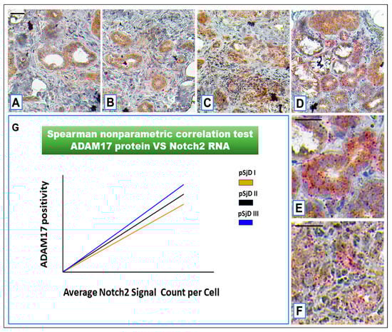 Notch2 RNA scope and ADAM17 protein detection in pSjD SGs tissue sections of healthy control (A) and patients to different inflammatory grades (pSjDI, pSjDII, pSjDIII) (B–D). Images (E,F) represent the magnification of acini and ducts of pSjD III tissues. Notch2 mRNA was analyzed by in an in situ hybridization technique, and ADAM17 protein was detected by immunohistochemical analysis in pSjD SGs tissue sections of healthy control (A) and patients of different inflammatory grades (pSjDI, pSjDII, pSjDIII) (B–E). Image (E) represents the magnification of acini and ducts of pSjD III tissues. Image (G) represents the graph of correlation between Notch2 mRNA and ADAM17 protein. The Spearman non-parametric correlation test demonstrates a significant correlation between ADAM17 protein expression and Notch2 mRNA. All images were scanned and analyzed with an Aperio ImageScope instrument. Bar = 20 μm.