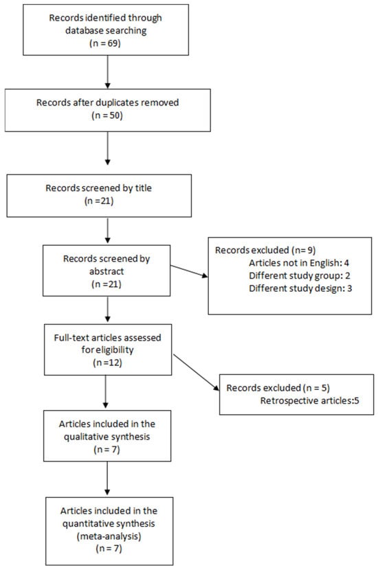 Following the search carried out according to the criteria defined in the Methods section, 69 articles were identified, of which seven were RCTs and considered eligible and included in the meta-analysis [20,21,22,23,24,25,26]. The PRISMA flowchart of the study selection is presented in Figure 1. The seven eligible RCTs included a total of 758 women (379 in the EPCD group and 379 in the TPCD group) who underwent either primary or repeat CD. Four of the seven trials were registered in the clinical trials registry [20,21,24,25], and the enrollment of the first participant was prior to the registration date, except for one [20].