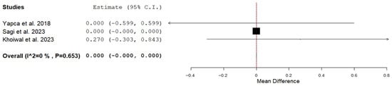 Incision to delivery time was 7.5 ± 5.0 min in the EPCD compared with 6.2 ± 3.7 min in the TPCD (weighted mean difference (WMD): 2.23; 95% CI: 0.40 to 4.06; p = 0.017; I2 = 98.0%) (Table 2). Sensitivity analysis indicated that the overall pooled mean difference for incision-to-delivery time was not materially affected by the exclusion of any individual trial, with pooled estimates ranging from 1.5 to 2.9. A meta-analysis of Apgar scores at 1 min could not be conducted, as six of the seven studies lacked the necessary data to compute standard deviations. Apgar scores at 1 and 5 min, as reported in each article, did not differ significantly between the EPCD and the TPCD groups within each trial. We performed a meta-analysis on the Apgar score at 5 min, and the score was similar between the groups (Figure 2 and Table 2). Mean umbilical artery pH was 7.302 ± 0.02 and 7.300 ± 0.00 in the EPCD and the TPCD groups, respectively (WMD: 0.01; 95% CI: 0.004 to 0.016; p = 0.001; I2 = 0%). The rate of umbilical cord artery pH < 7.2 was 7.9% and 2.3% in the EPCD and TPCD, respectively (p = 0.047) (Table 2). Umbilical cord artery pH < 7.2 was reported in 2 studies (336 neonates) [24,25]. In one study, the authors summarized that all neonates had an uneventful outcome [24], and in the second, the authors stated that none had a pH < 7.0 [25]. The necessity of Teissier spatula use to assist deliveries in cases of limited space for fetal extraction and its consequences was not persistently reported for the EPCD group and thus was not analyzed. Additionally, rates of artificial ventilation, neonatal intensive care unit admission, and any neonatal trauma were also not reported and thus not analyzed.