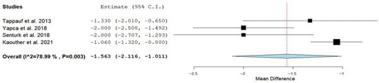 Intraoperative outcomes were comparable (Table 3). Postoperative pain assessed by Visual Analogue Scale (VAS) score at 24 h was 2.7 ± 0.9 and 4.4 ± 1.2 in the EPCD group compared with the TPCD group (WMD: −1.56; 95% CI: −2.12 to −1.01; p < 0.001; I2 = 78.99%) (Figure 3 and Table 3). Sensitivity analysis of mean postoperative pain at 24 h indicated that the overall pooled effect size was robust, as exclusion of any single trial did not materially alter the pooled mean difference (range: 1.39–1.81). VAS score was also lower in the EPCD group compared with the TPCD group at 12 and 18 h (p = 0.039 and 0.001, respectively). At 6 h, the VAS score was also lower, but the difference was not significant (p = 0.079). Time to maternal gas passage was 7.4 ± 2.7 h in the EPCD group compared with 14.7 ± 2.7 h in the TPCD group (WMD: −4.64; 95% CI: −5.53 to −3.76, p < 0.001; I2 = 33.03%). Sensitivity analysis of the mean time to first gas passage indicated that the overall pooled effect size was robust, as exclusion of any single trial did not materially alter the pooled mean difference (range: 4.5–5.1). Length of hospital stay was similar between the groups (p = 0.49) (Table 3).