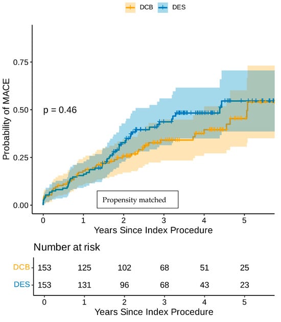 Kaplan–Meier estimator plot of MACE for DCB-only vs. DES-only angioplasty (propensity-matched).