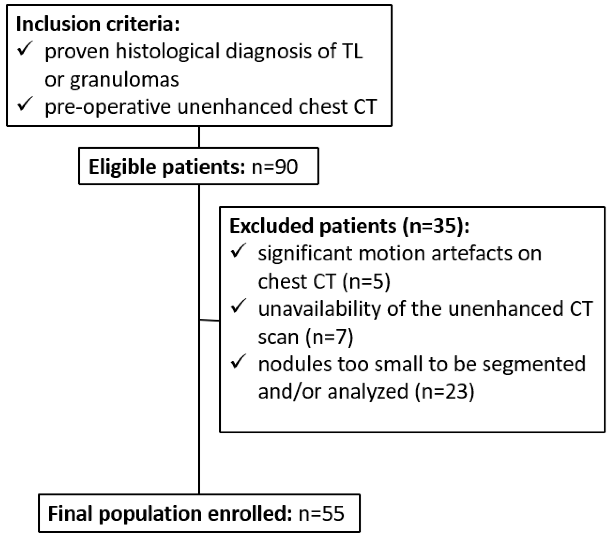 | Nodules CT Findings | Total Patients (n = 55) | Tumorlets Group (n = 32) | Granulomas Group (n = 23) |