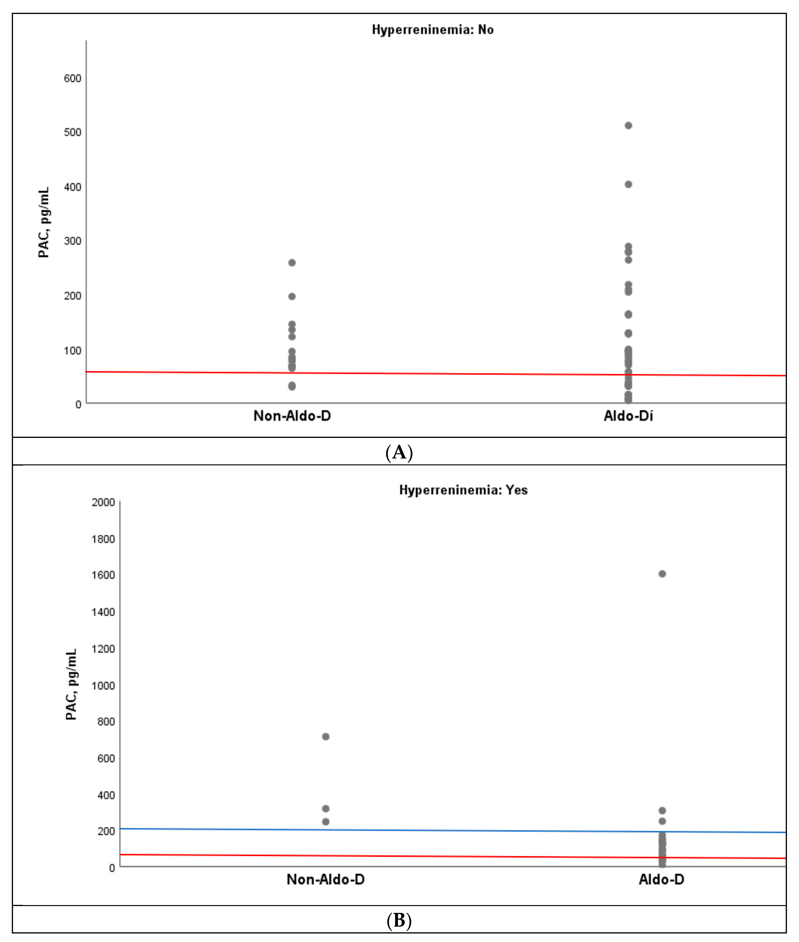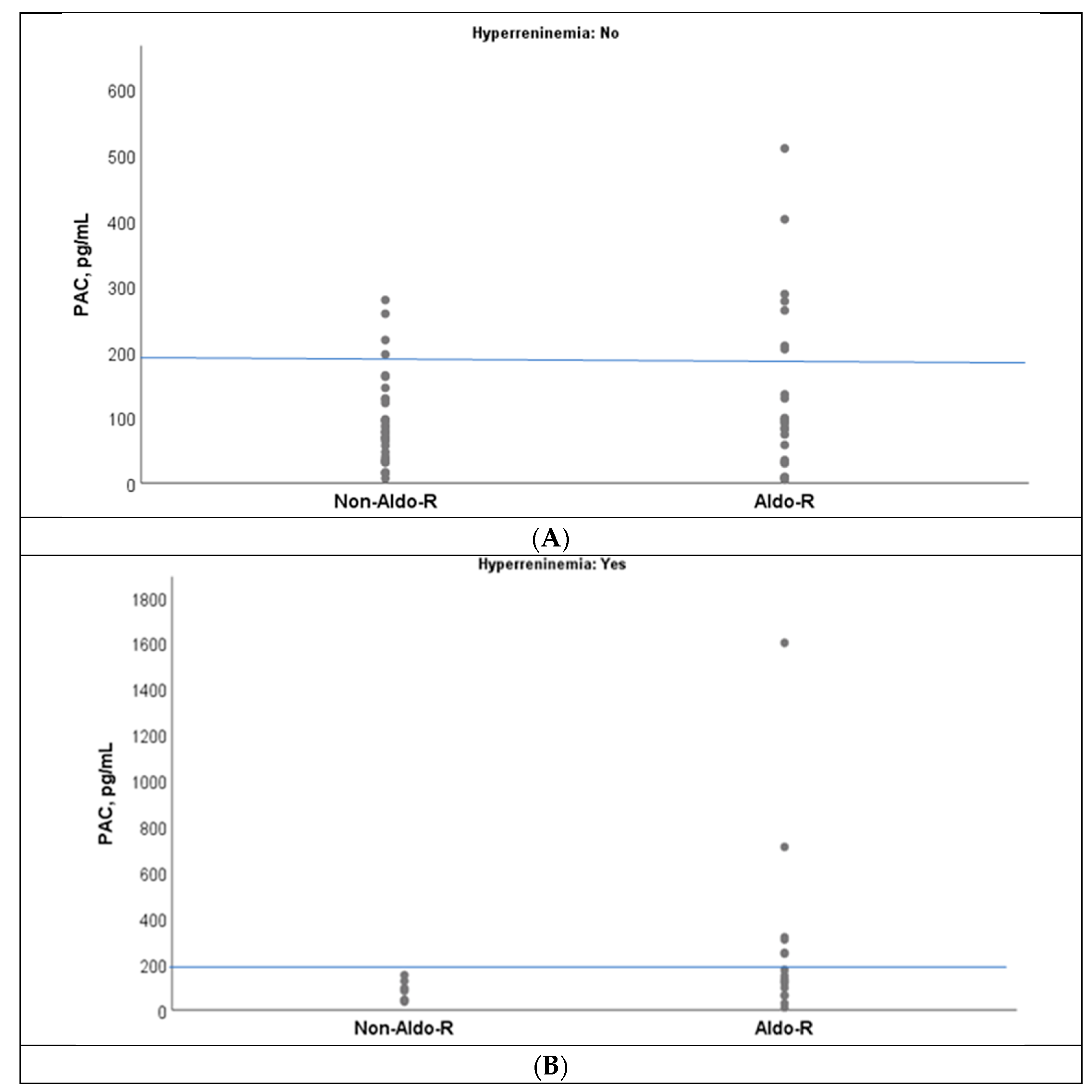 Figure 3A,B). However, no case with non-Aldo-R had PAC values ≥ 200 pg/mL during hyperreninemia (
